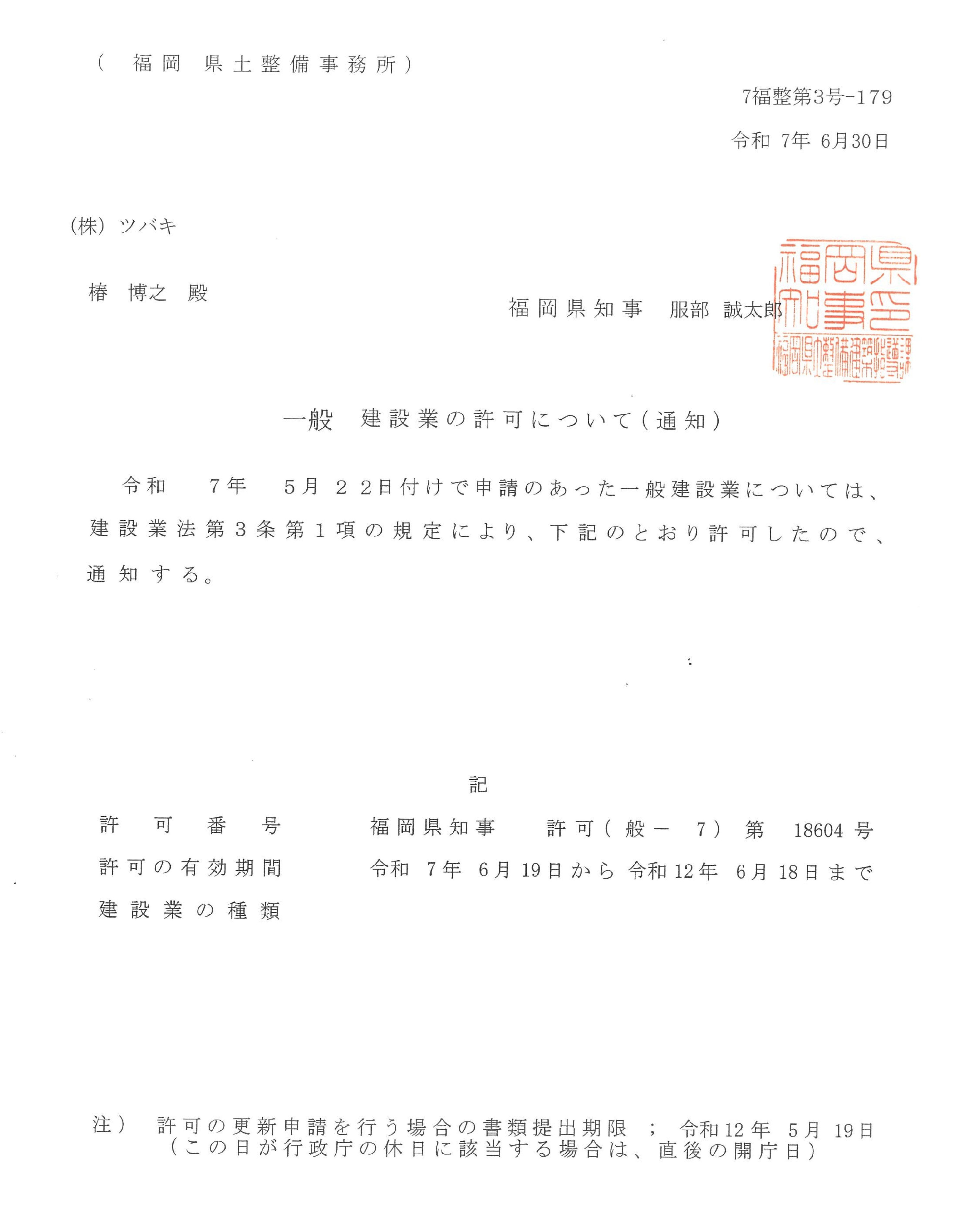 弊社は豊富な施工実績により、福岡県知事より「建築工事業」および「内装仕上工事業」の2つの建設業許可を受けております。防犯カメラ・監視カメラの施工においても、お客様のご要望通りに仕上げるために役立つ建設業許可です。